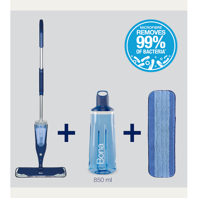 Incrivelmente versátil, a Bona Spray Mop Premium proporciona o máximo cuidado e proteção para pavimentos de madeira impermeabilizados. A fórmula de pH neutro está pronta a utilizar, seca rapidamente e deixa um brilho natural sem riscos. Já não precisa encher um balde - basta pulverizar para uma limpeza rápida e eficaz. É importante certificar-se de empujar bien la botella hasta escuchar un clic!.