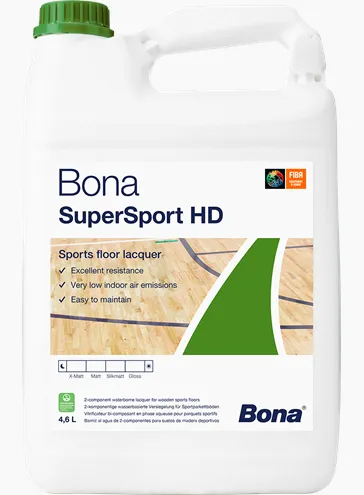 O Bona SuperSportHD é um acabamento bicomponente à base de água (100% poliuretano) de alto desempenho, especialmente formulado para pavimentos de madeira em instalações desportivas, ginásios e espaços com elevado tráfego pedonal.