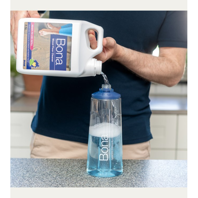 - Preencher a garrafa recarregável Bona com o detergente.